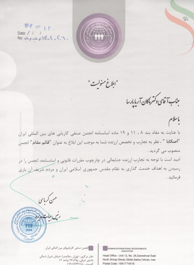 تصویر حکم انتصاب دکتر آریا پارسا به سمت قائم مقام انجمن صنفی کاریابی های بین المللی ایران (اصکابا) در ادامه آورده شده است: