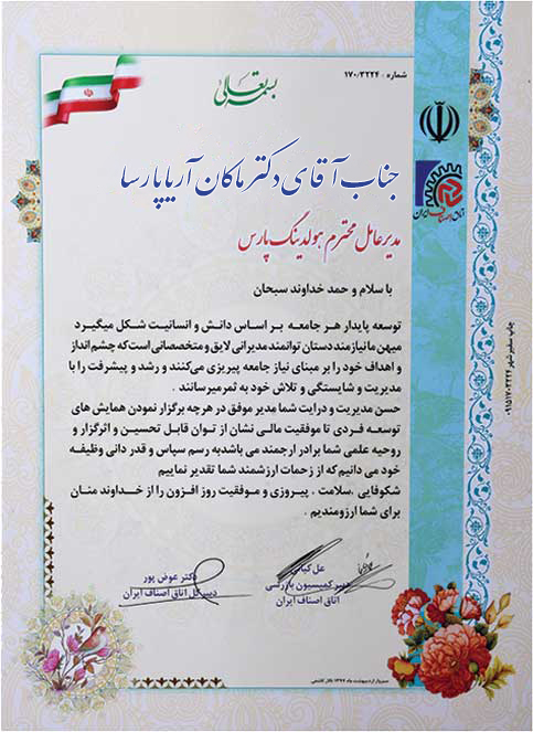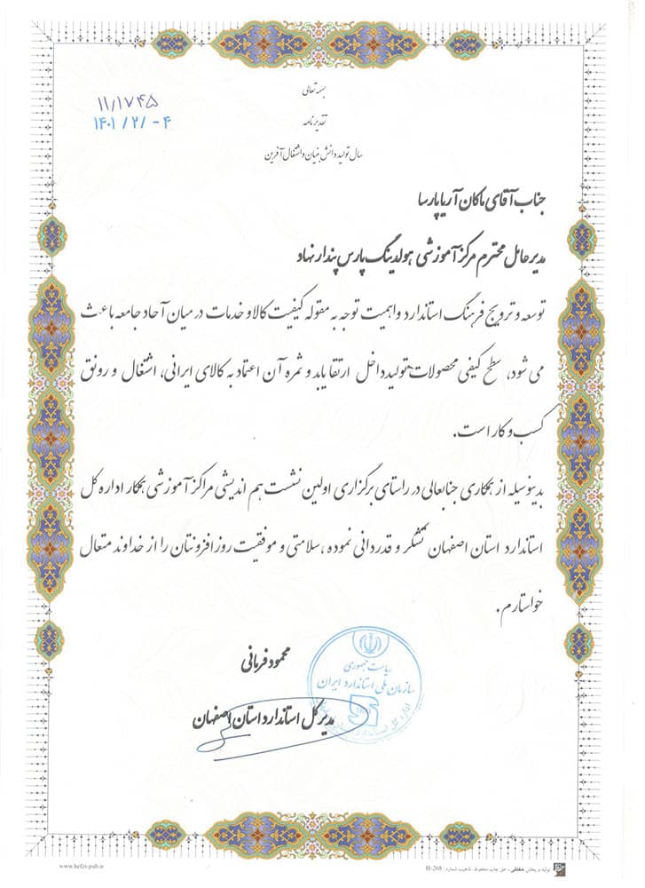تقدیرنامه از طرف مهندس محمود فرمانی، مدیر کل استاندارد استان اصفهان