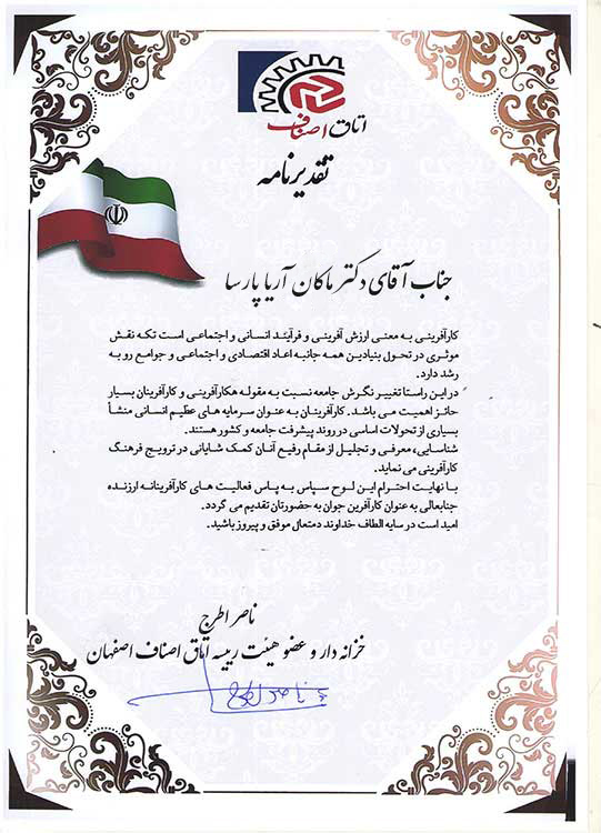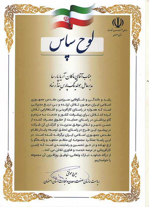 تقدیرنامه از طرف ریاست سازمان صنعت، معدن و تجارت استان اصفهان