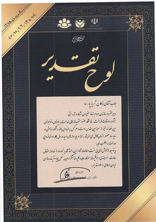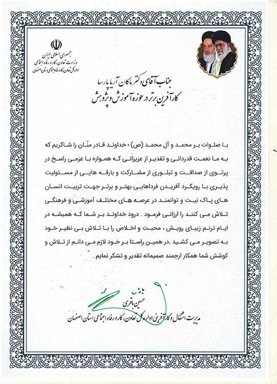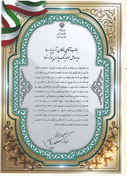 تقدیرنامه ازطرف مدیر کل دفتر امور اجتماعی و فرهنگی استانداری اصفهان