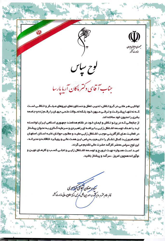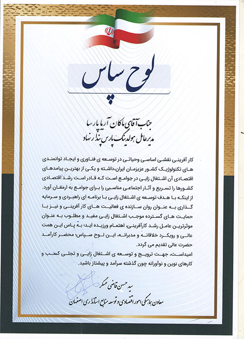 تقدیرنامه از طرف معاون هماهنگی امور اقتصادی و توسعه منابع استانداری اصفهان