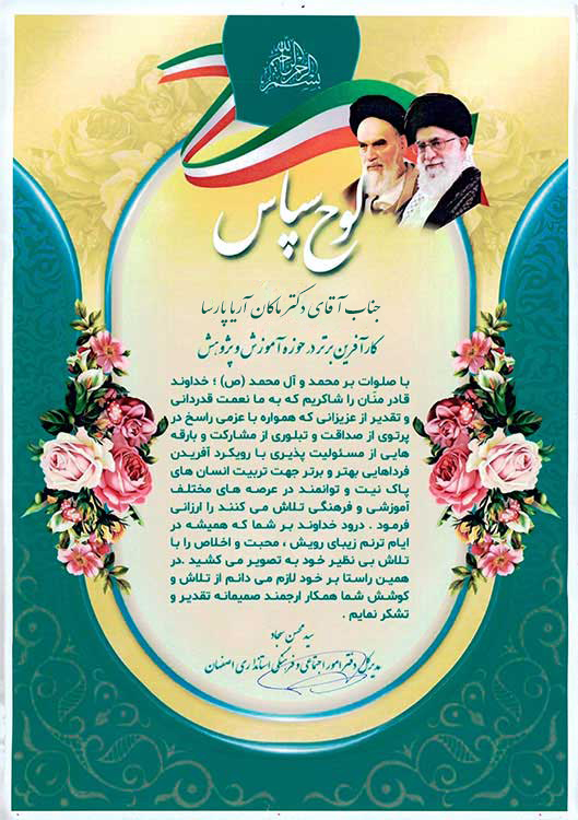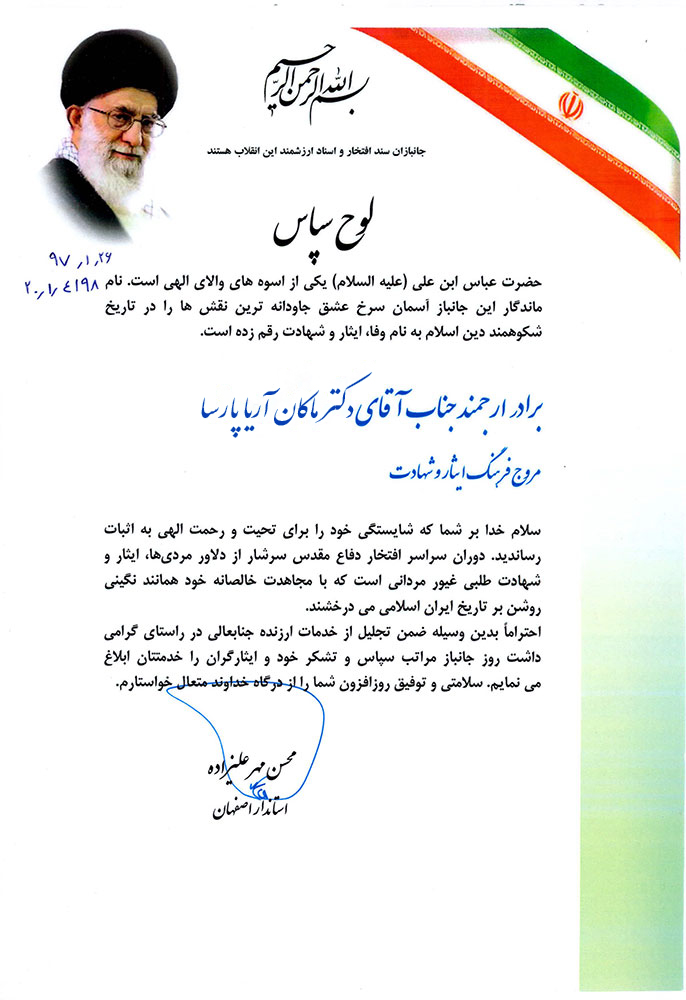 تقدیرنامه ازطرف عباس رضایی – استاندار اصفهان