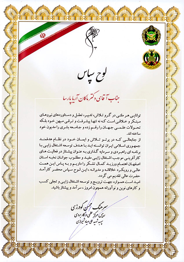تقدیرنامه از طرف جناب سرهنگ محسن گودرزی – رئیس مرکز علمی و کاربردی