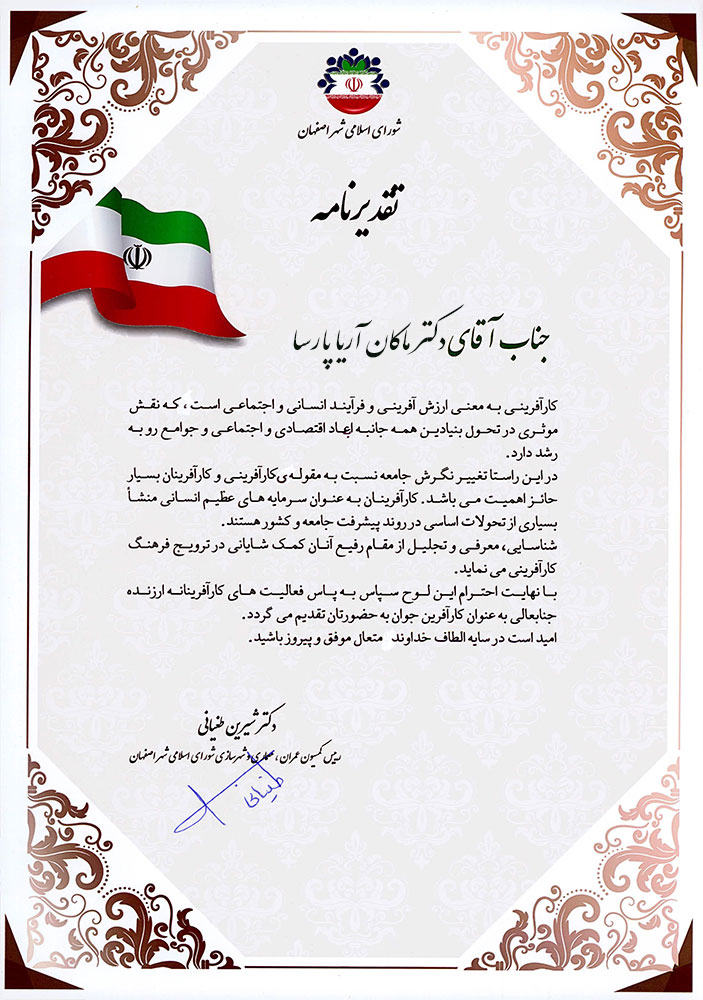 تقدیرنامه از طرف رئیس کمیسیون عمران، معماری و شهرسازی شهر اصفهان