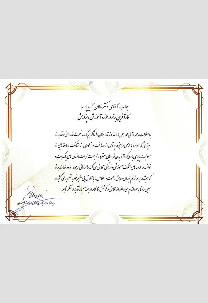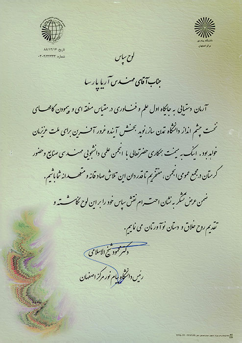 تقدیرنامه ازطرف دکتر محمد شیخ الاسلامی – رئیس دانشگاه پیام نور مرکز اصفهان