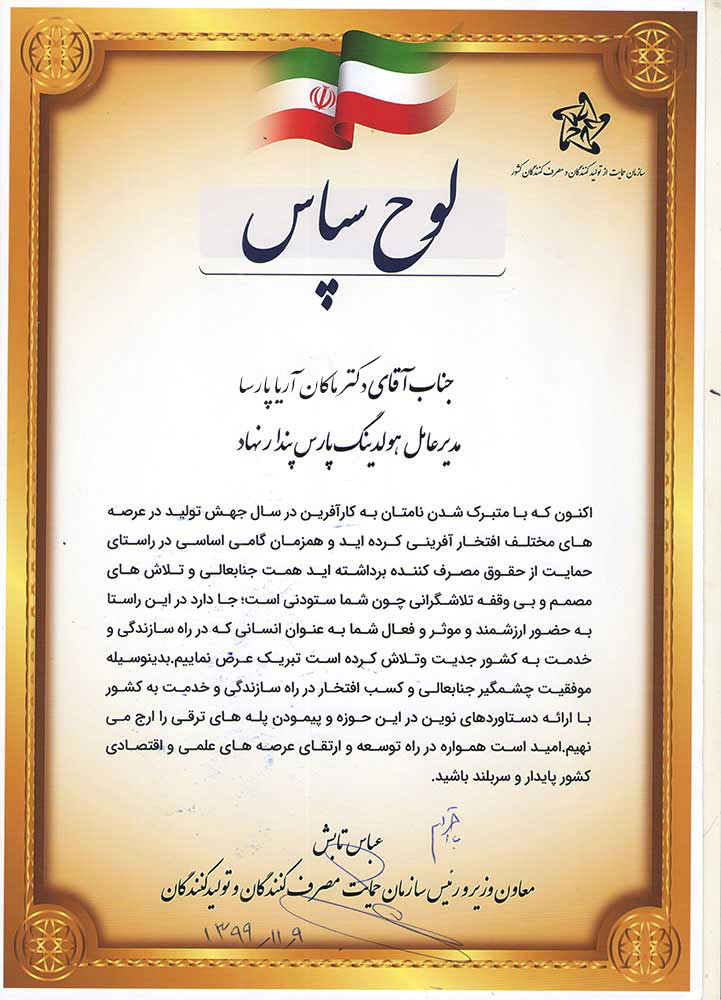 تقدیرنامه از طرف جناب آقای عباس تابش – معاون وزیر و رئیس سازمان حمایت مصرف کنندگان و تولید کنندگان